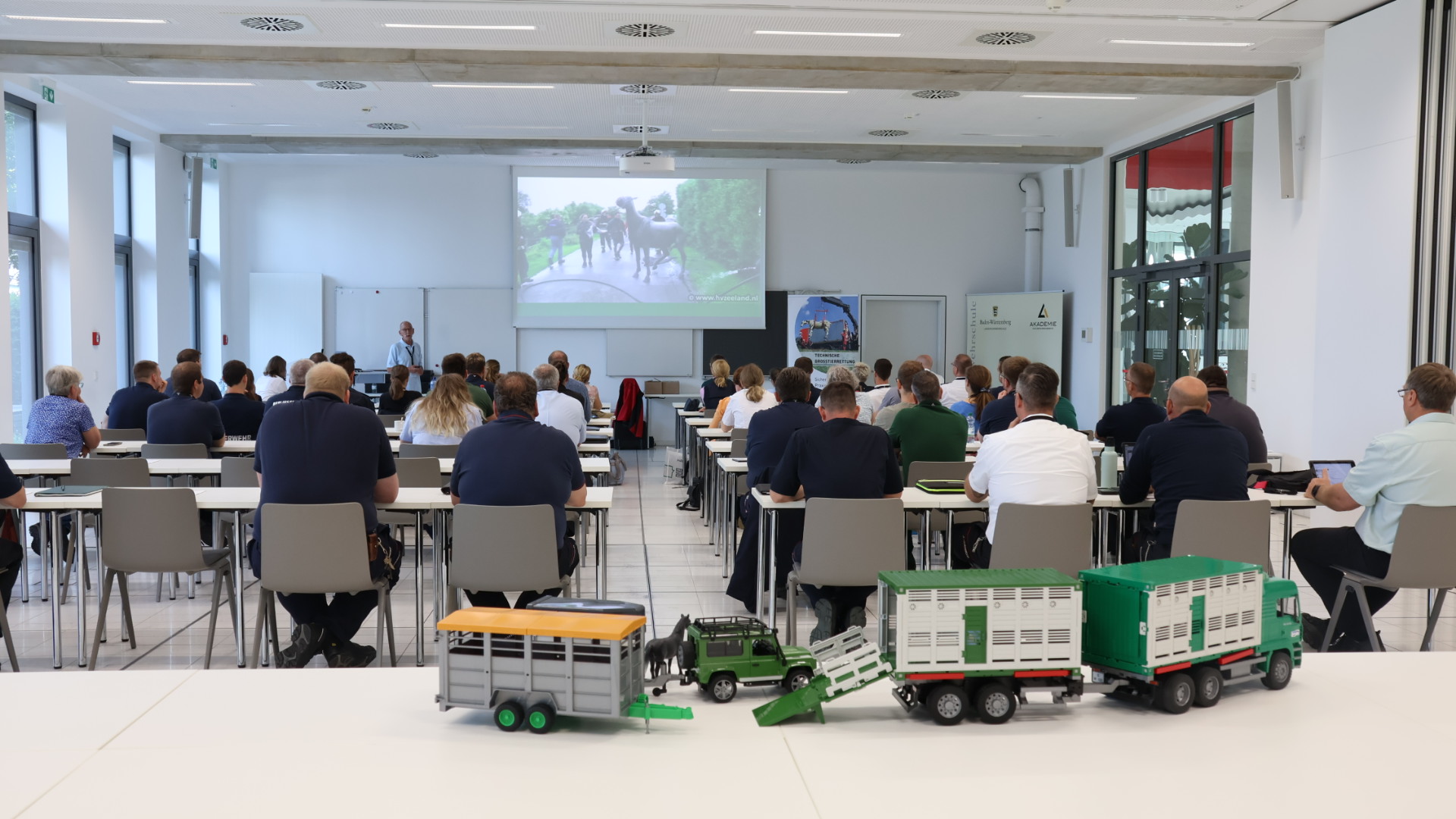 Im Juni haben sich erstmals Feuerwehrkräfte und Amtstierärzte aus ganz Baden-Württemberg zu einem Seminar „Großtierrettung – Zusammenarbeit von Feuerwehr und Amtstierärzten im Einsatz" an der Landesfeuerwehrschule Baden-Württemberg für Gefahrenabwehr getroffen.Bei der konkreten Themenstellung dieses Seminars „Rettung von Großtieren“ erfolgte die Planung und Durchführung des Seminars in Kooperation mit der Akademie der Landesfeuerwehrschule Baden-Württemberg.